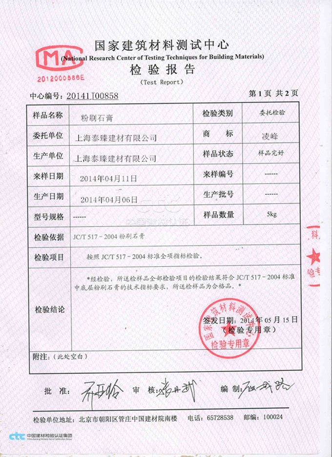 國家建筑材料測試中心檢驗報告